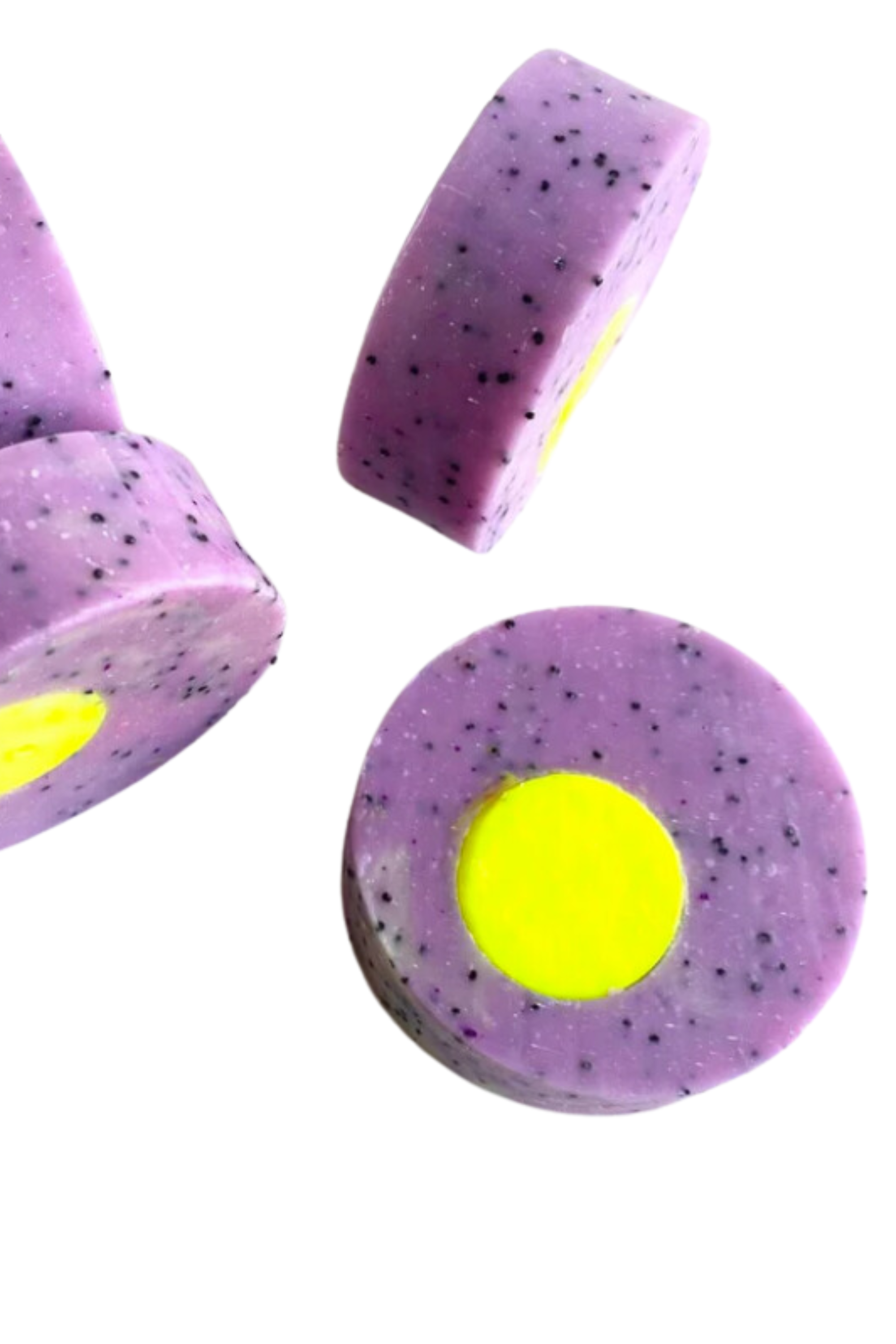 The Mathilda soap with neon yellow and purple speckles is an eye-catcher in your bathroom. It is suitable for both hand and body care. The Mathilda soap smells soft and fresh of white tea. This scent has both a mood-enhancing and balancing effect and the poppy seeds in the soap exfoliate your skin in a natural way.