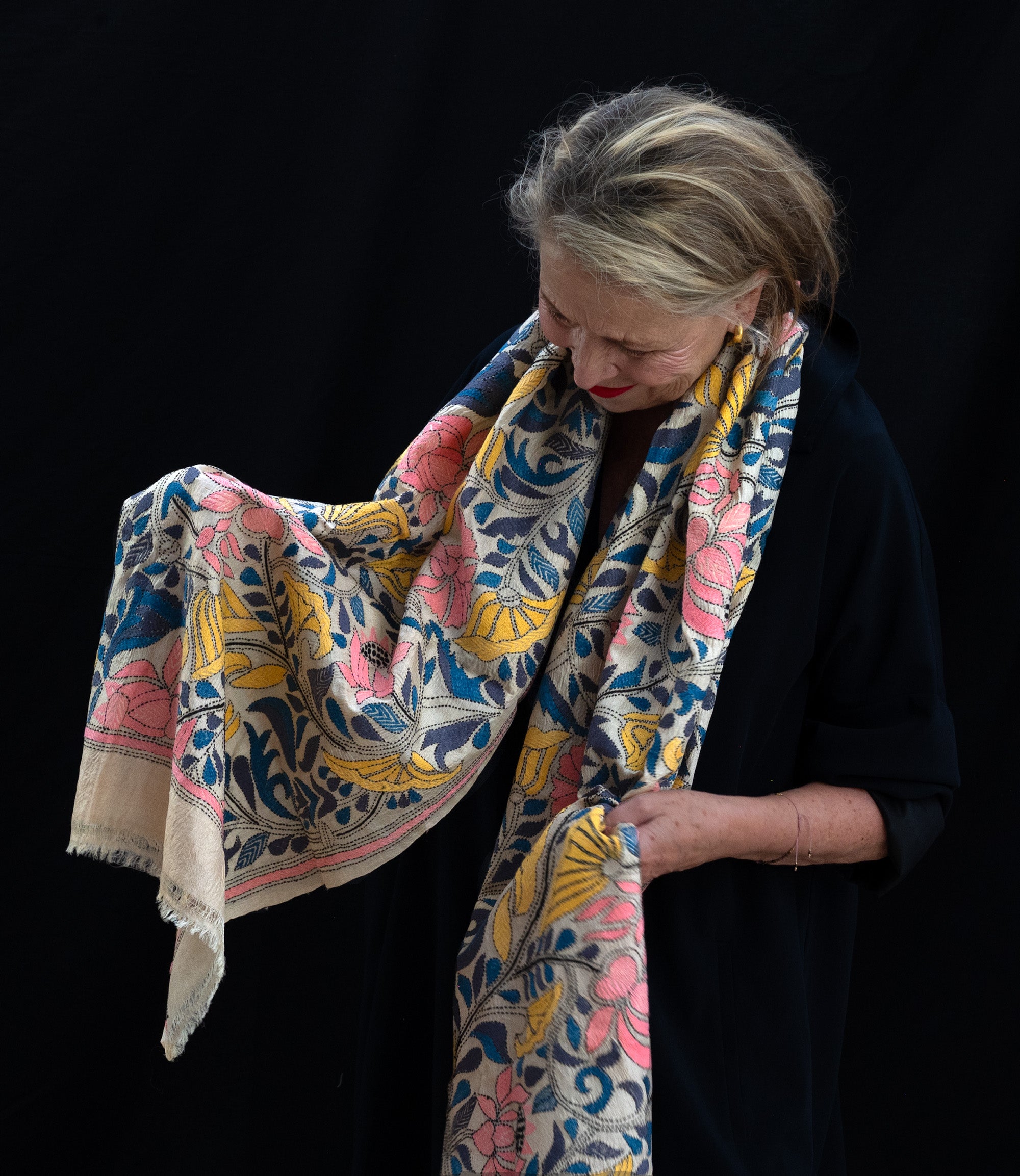 Deze sjaal is een draagbaar kunstwerk, en staat fantastisch op een spijkerbroek, en tegelijkertijd heel chique op een mooie jurk.