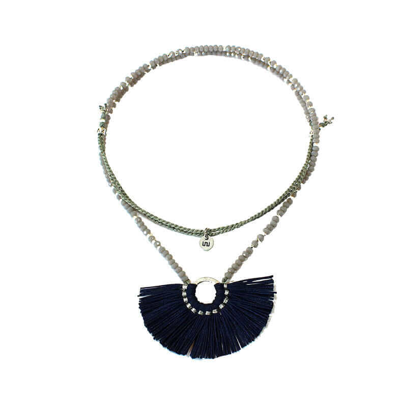 This stylish Fan Tassel Necklace Navy Blue is handmade with braided cord, semiprecious stones, silver beads and a blue fan tassel pendant.