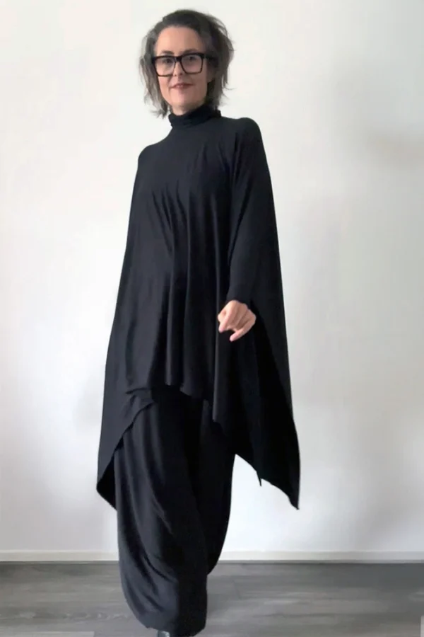 Stijlvolle, lange trui met split vooraan en een v-hals of een col, de trui is open aan de zijkant en valt extra lang van achteren