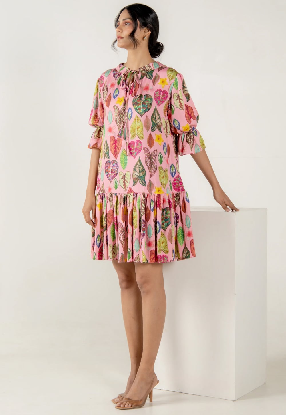 • A playful short dress with front tie ups, balloon sleeves and flared tier at the bottom.
