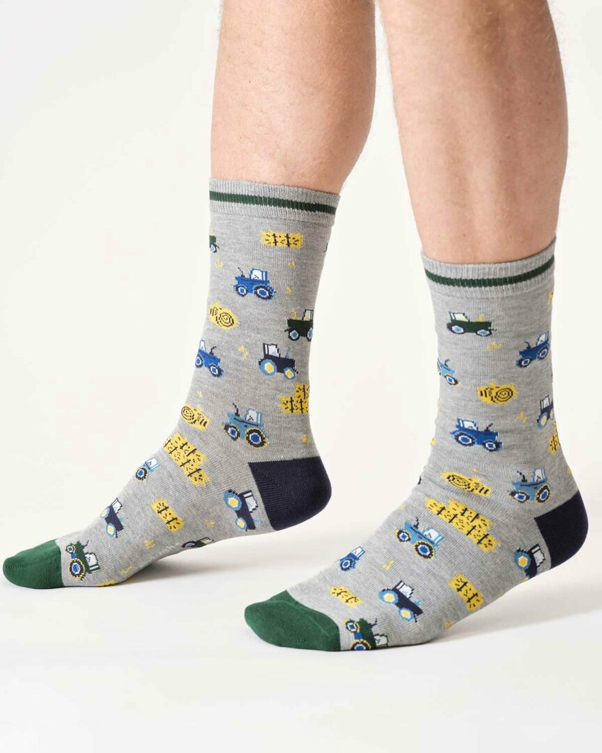 Katoenen heren sokken met boerderij – grey marlDeze lichtgrijze katoenen sokken van Thought zijn een ode aan het buitenleven. Met groene en blauwe trekkers, hooibalen en contrasterende accenten zoals een donkergroene teen en boord en een donkerblauwe hiel, zijn het sokken met een knipoog én een verhaal. Gemaakt van zacht biologisch katoen en gerecyclede materialen bieden ze comfort én karakter. Perfect voor de liefhebber van het boerenleven, of gewoon van leuke sokken.