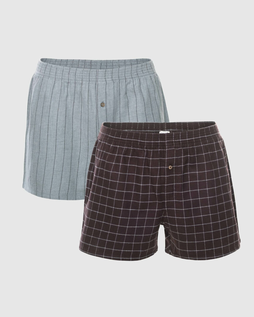 Deze wijde flanellen katoenen herenboxershorts zijn gemaakt van 100% biologisch katoen flanel. De flanelstof zorgt voor een heerlijk zacht gevoel en hiermee voor een hoog draagcomfort. De tailleband is elastisch en zorgt voor een goede aansluiting. De gulp heeft een vegetarisch knoopje. Eén wijnrode grijs geruite boxershort en één grijs gestreepte boxershort.