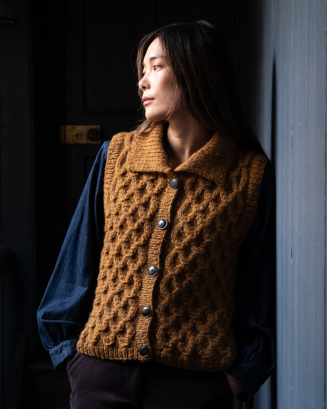 This gilet-style hand-knitted vest combines functionality and style in the cosiest way. Crafted from a special hand-spun, hand-dyed yarn blend of mohair and sheep wool, it wraps you in softness and warmth. The vest features intricate Aran pattern work on the front, a polo collar, and sustainable engraved buttons. It's a versatile layering piece you'll treasure and wear all season long; made in an autumnal whiskey hue, it will add a rich, earthy tone to your winter wardrobe. What makes these knits truly special is the artistry behind them. Each one is meticulously crafted by skilled artisans, often in their own homes, taking a week to complete – they are the essence of slow fashion. We honour their exceptional craftsmanship with a signature on the label, making each vest a unique piece that blends quality and personal touch.