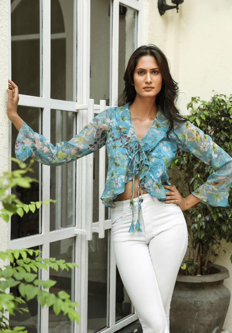 V neck-line with ruffles, tie up detailing, comfortable and and good fit with our breathable and sustainable chiffon fabric in harbour print in sustainable tencel fabric in India by our talented artisans.