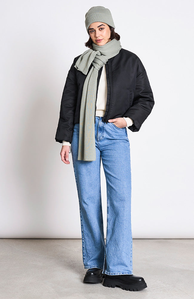 Leuke lichtgroene sjaal van het Duitse merk JAN 'N JUNE gemaakt van zacht biologisch katoen. Draag haar met bijpassende muts.