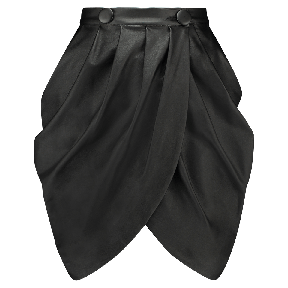 Black faux leather draped mini skirt. The skirt features draped cross over skirt with button closure. Can be worn as a skirt or in combination with pants. Handmade in the Netherlands.