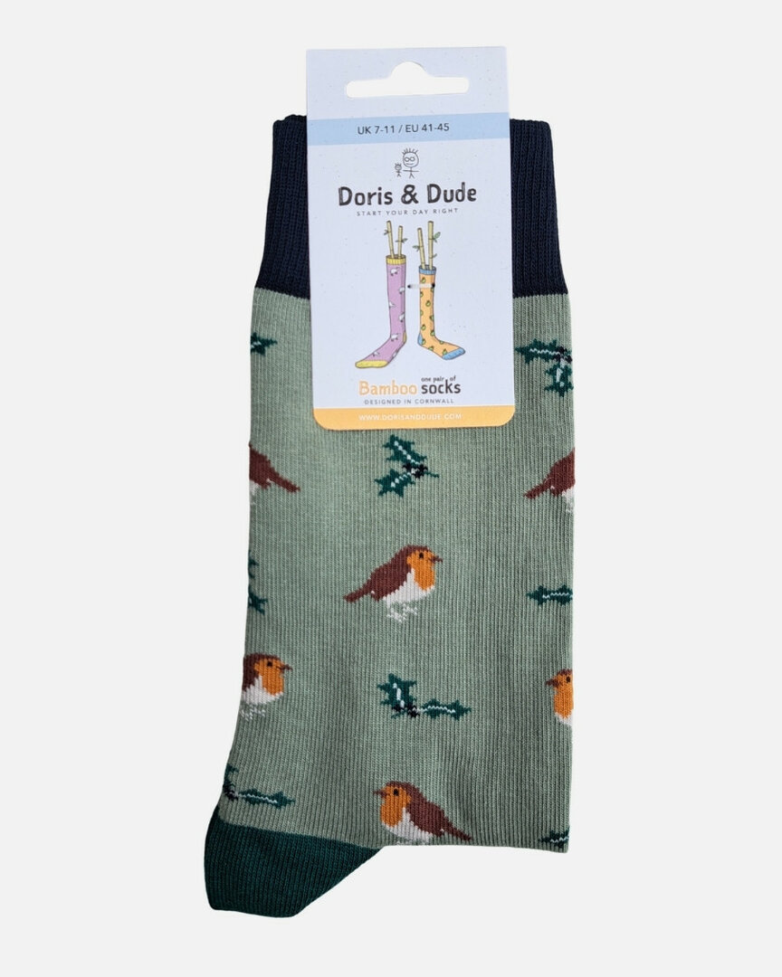 Herensokken met roodborstjes - lichtgroenDe Doris & Dude bamboe herensokken met roodborstjes lichtgroen zorgen voor een frisse en vrolijke uitstraling. Met hun oranje borst zijn roodborstjes gemakkelijk te herkennen en al eeuwenlang een vertrouwde verschijning in tuinen en parken. Op de lichtgroene sokken komen de roodborstjes prachtig naar voren. Deze comfortabele sokken zijn beschikbaar in EU 41-45.